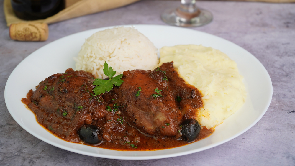 4. Seguidamente, vierte el vino tinto, la hoja de laurel, el caldo de pollo y las presas de pollo. Rectifica sazón, baja el fuego y deja cocinar por aproximadamente 25 minutos.